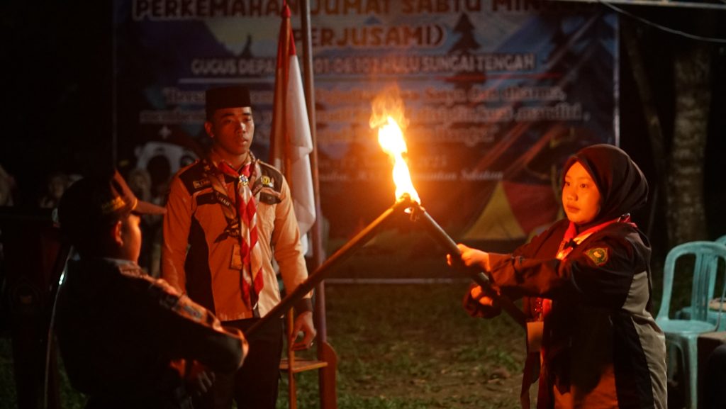 Pada malam harinya, kegiatan dilanjutkan dengan upacara api unggun yang berlangsung khidmat dan meriah. Api unggun dinyalakan sebagai simbol semangat dan persaudaraan para peserta. Acara malam semakin semarak dengan pentas seni, di mana tiap regu menampilkan kreativitas mereka melalui tarian. Sebagai penutup hari kedua, dilakukan renungan malam yang membawa suasana haru dan reflektif, mengajak peserta merenungkan nilai kebersamaan, kemandirian, dan rasa syukur.