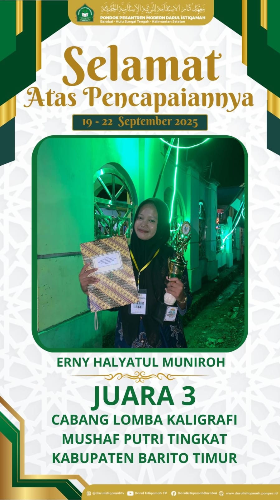 Ustazah PPM Darul Istiqamah Putri Raih Juara 3 Kaligrafi Mushaf pada MTQ Tingkat Kabupaten Barito Timur