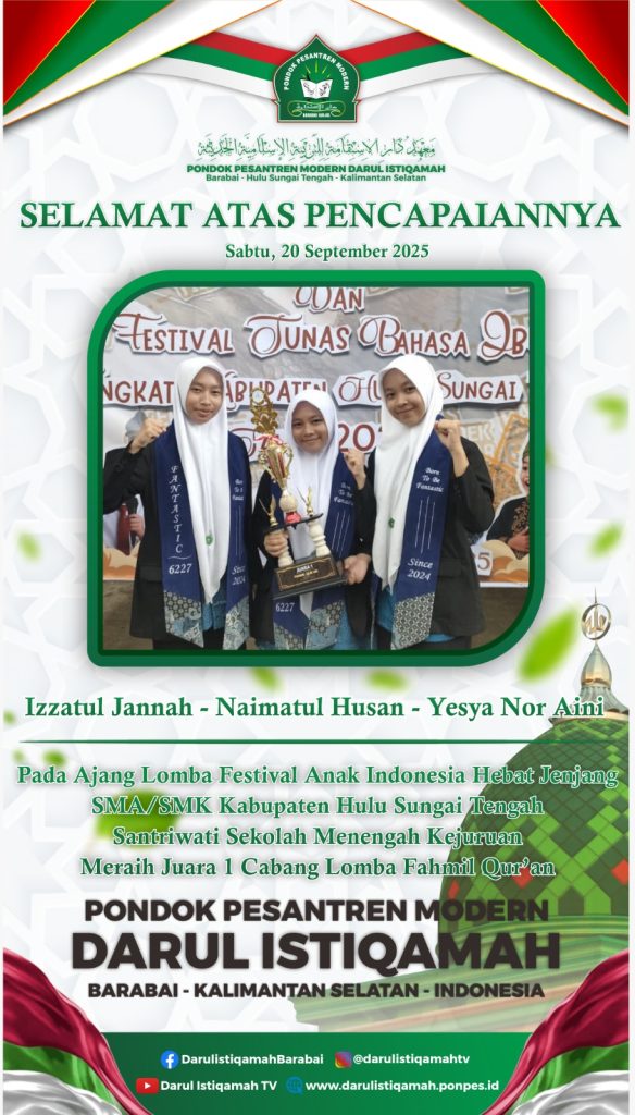 Barabai (PPM Darul Istiqamah) – Santriwati Pondok Pesantren Modern (PPM) Darul Istiqamah berhasil meraih Juara Pertama dalam lomba Fahmil Qur’an tingkat SMA/SMK se-Kabupaten Hulu Sungai Tengah (HST) pada ajang Festival Anak Indonesia Hebat (FAIH) 2025